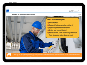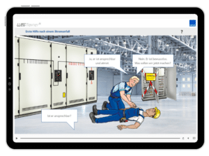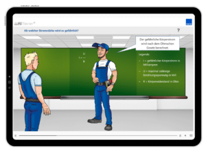 Ein Stromunfall kann lebensgefährlich sein! Elektro-Azubis arbeiten in einem sensiblen Bereich. In diesem E-Learning-Kurs lernen die Auszubildenden die Gefahren des elektrischen Stroms einzuschätzen und sie erfahren, wie sie sich nach einem Stromunfall richtig verhalten. Hier macht das Lernen Spaß, denn der Kurs ist spielerisch und interaktiv gestaltet – mit Quizfragen, Rechenaufgaben oder Schätzungen. Der Elektro-Azubi greift in das Geschehen ein und gestaltet den Ablauf aktiv mit.