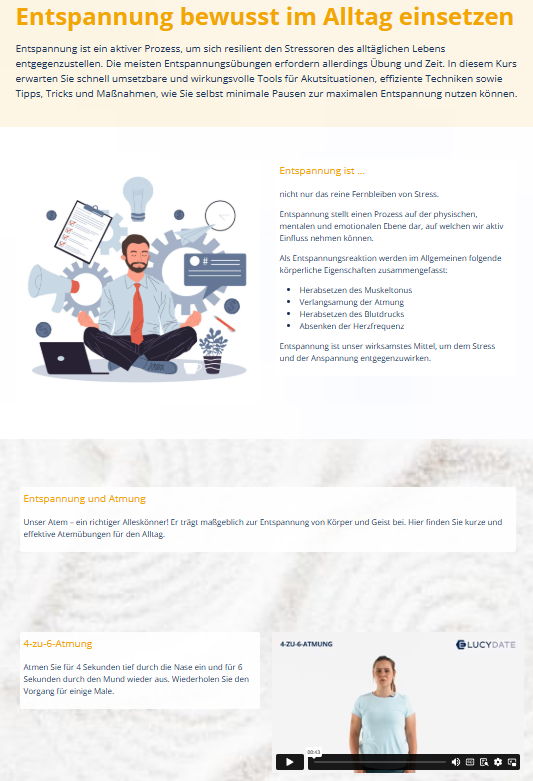 In unserem E-Learning-Kurs „Entspannung bewusst im Alltag einsetzen“ entdeckst du praxisnahe Techniken für mehr Wohlbefinden. Du lernst, wie sich Entspannung bewusst in deinen Alltag integrieren lässt – einfach, schnell und nachhaltig.